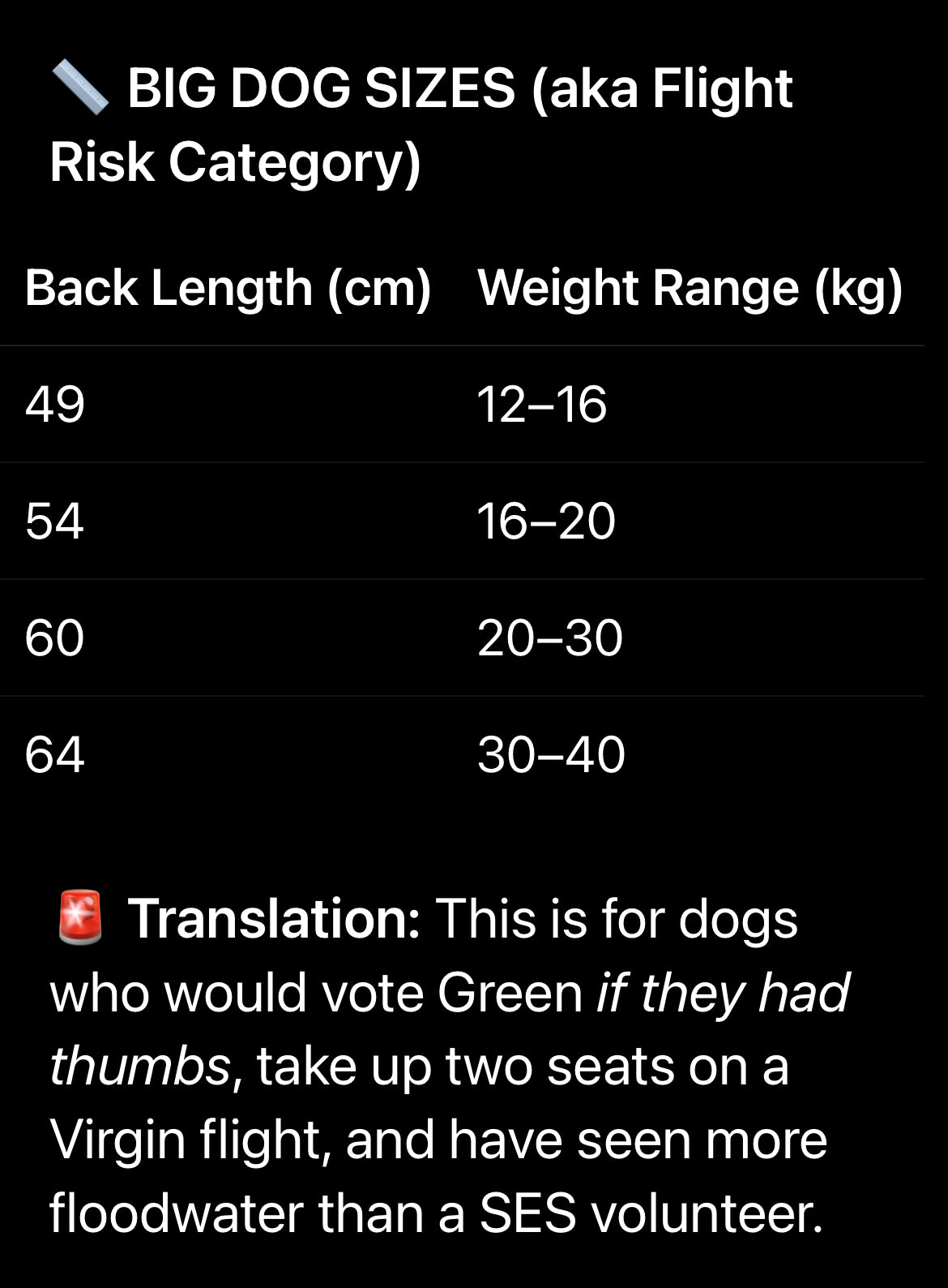 Whether they’re blocking bulldozers, herding councillors, or just vibing in the departure lounge at Virgin check-in, this bold black tee lets your floof stand tall (literally) for transparency, truth, and table scraps.
