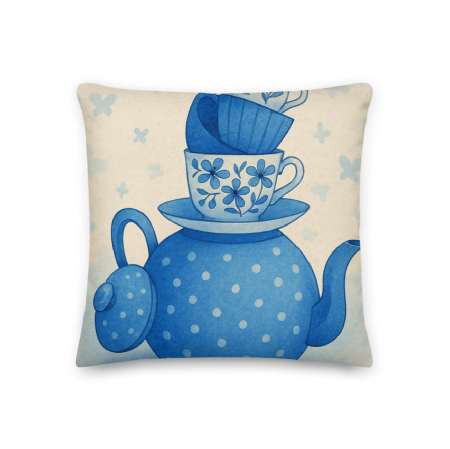Part of The Quiet Tabletop Uprising by Teacup Anarchy, this cushion features a whimsical stack of floral teacups atop a polka-dotted kettle, blooming in bold blues.